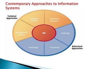 The document introduces Management Information Systems (MIS), emphasizing the distinction between raw data and meaningful information, which supports decision-making. It outlines the components of an information system, including hardware, software, data, people, and processes, and explains how MIS aids in collecting, processing, and generating reports to enhance operational efficiency. Additionally, it discusses the various subsystems within MIS that align with organizational functions and activities, and the importance of both technical and behavioral approaches in information systems.