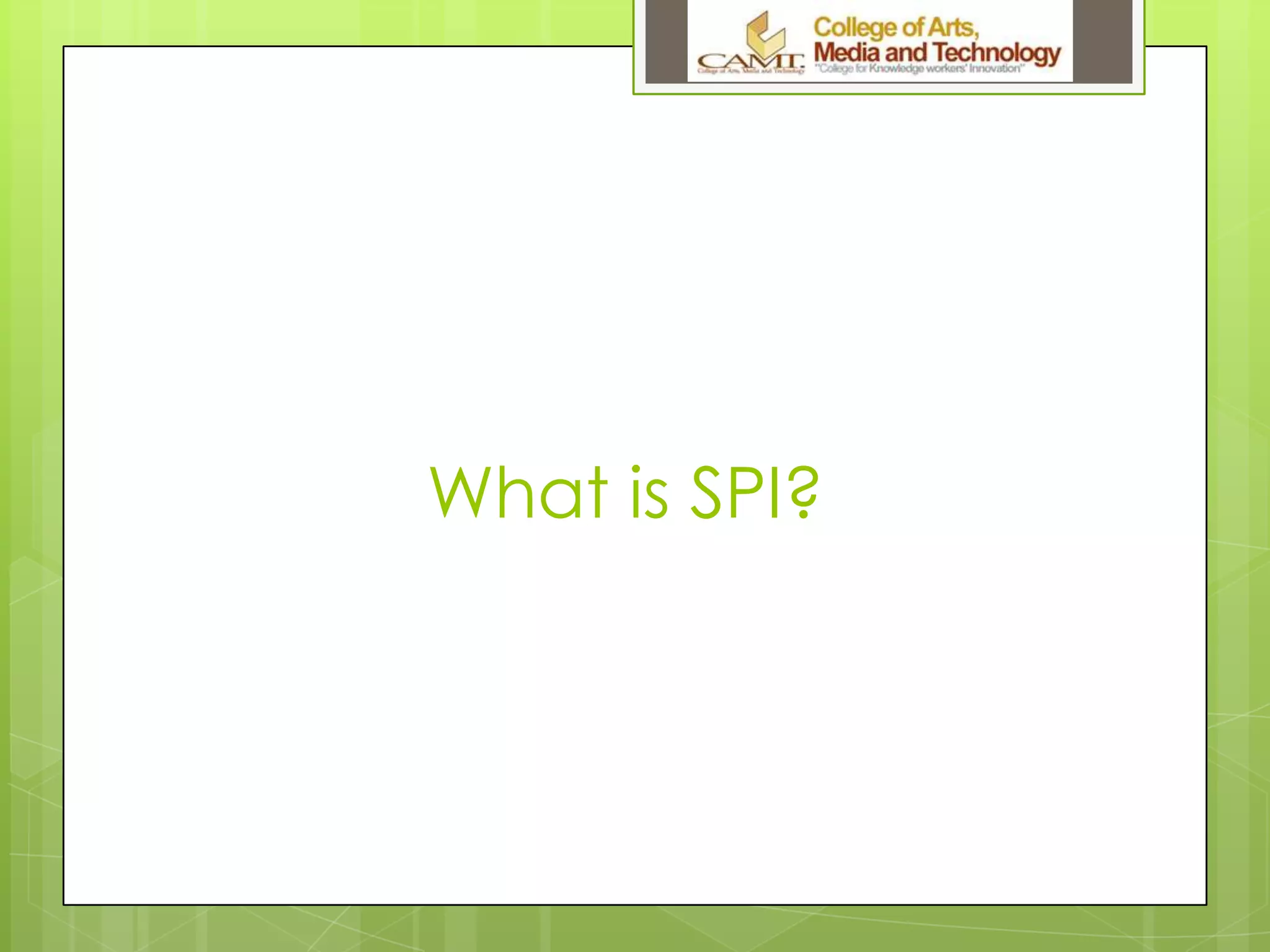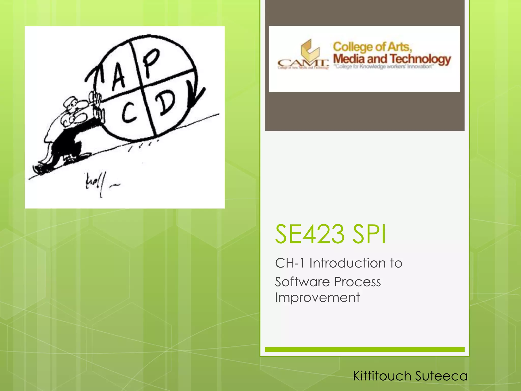 This document provides an introduction to software process improvement (SPI). It discusses what SPI is and explains that SPI involves planning, developing measurements, and making improvements. It also outlines the basic steps that can be taken after completing an SPI course, such as understanding software standards, analyzing development experiences, evaluating processes against standards, and designing solutions for improvement. Additionally, the document presents a case study on how process improvement worked for a company called Advance Information Services Inc. It discusses their process improvement strategy which involved project planning and tracking/control. Finally, it assigns students to read a technical report on SPI and answer questions about it by a certain deadline.
