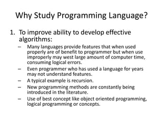 This document discusses programming language paradigms and design issues. It covers why programming languages are studied, including to improve algorithms, use existing languages more efficiently, choose the best language for a project, and more easily learn new languages. It then defines what a programming language is and discusses imperative, applicative, rule-based, and object-oriented paradigms. The document also addresses language standardization, internationalization, programming environments, effects on language design like separate compilation and testing support, and environment frameworks.