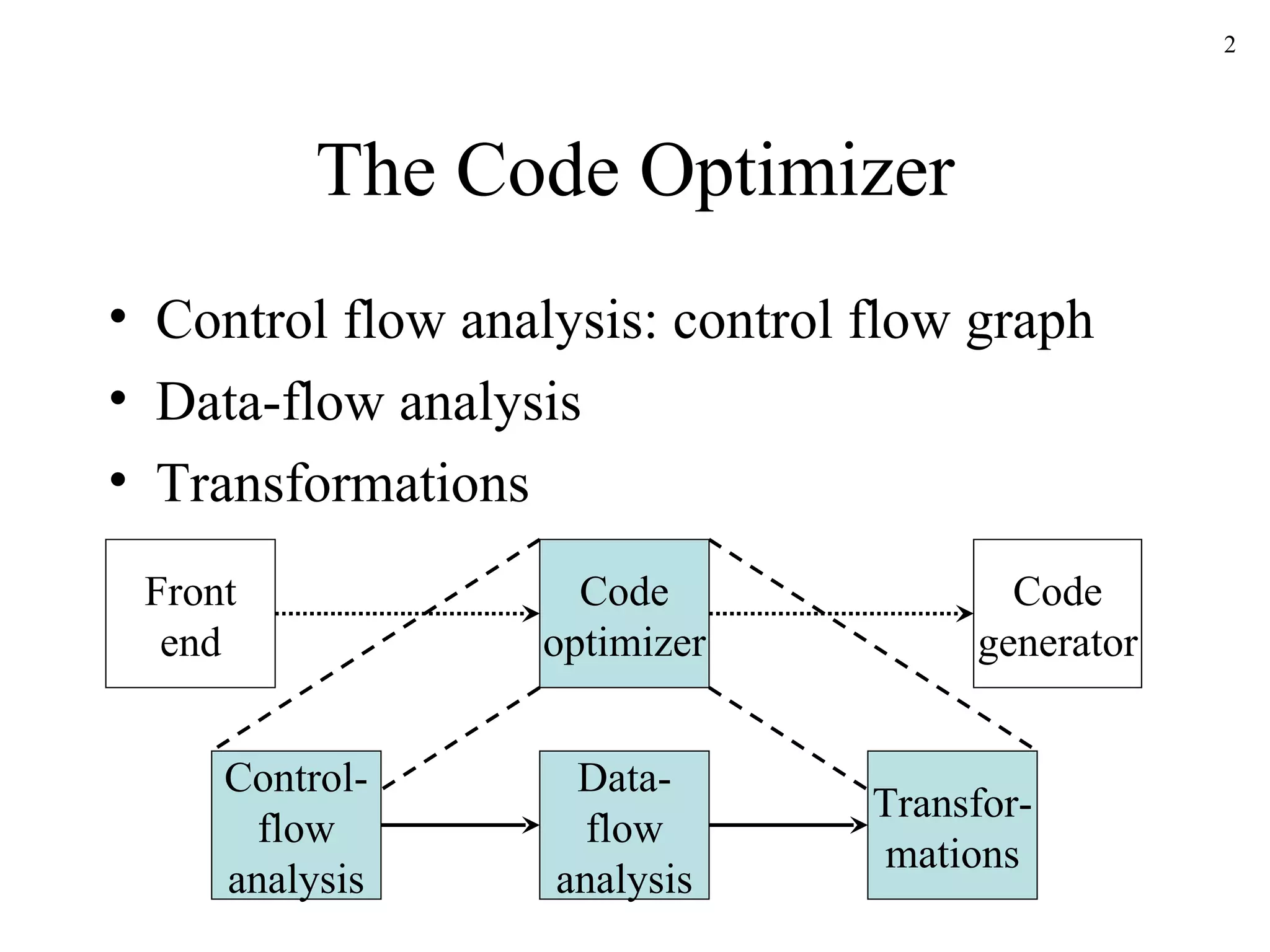 The document discusses code optimization techniques used by compilers, including control flow analysis, data flow analysis, and code transformations. It covers determining loops in a control flow graph using dominators, building dominator trees, and identifying natural loops. It also discusses reaching definitions as a data flow analysis problem and how bit vectors can be used to compute reaching definitions in a conservative manner to ensure safety.