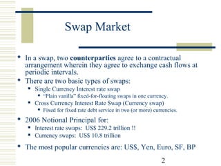 Currency and interest rate swaps allow companies to exchange interest rate and currency cash flows to hedge risks. Interest rate swaps exchange fixed and floating rate payments in the same currency. Currency swaps exchange interest payments in different currencies to fund projects abroad. Swap banks facilitate these exchanges and make markets in standard swaps, earning small spreads. Swaps benefit all parties by allowing each to borrow in their preferred currency or rate.