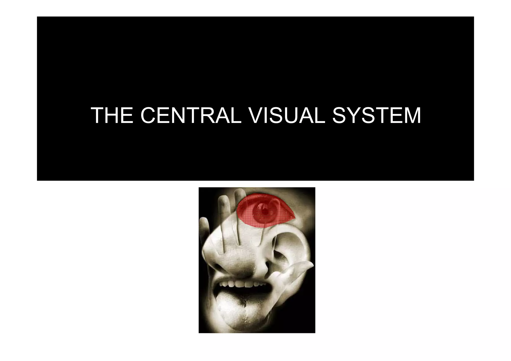 The central visual system includes the retina, optic nerve, optic chiasm, and optic tract. Visual information is transmitted from the retina to the lateral geniculate nucleus (LGN) in the thalamus via the optic nerve and optic tract. In the LGN, inputs from the left and right eyes are segregated. Visual information is then projected from the LGN to the primary visual cortex (V1), where it is organized retinotopically and separated into ocular dominance columns for further visual processing. V1 projects to both dorsal and ventral streams for motion analysis and object recognition, respectively.