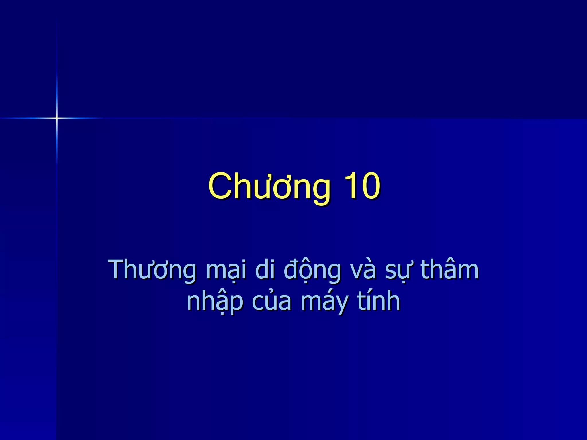 Chương 10 thảo luận về thương mại di động, các công nghệ hỗ trợ và các ứng dụng trong lĩnh vực tài chính và quảng cáo. Nó cũng đề cập đến hệ thống Nextbus, cho phép theo dõi thời gian đến của xe bus trong thời gian thực, cùng với các đặc tính, lợi ích và rào cản của thương mại di động. Chương này cũng đưa ra các ví dụ về các ứng dụng di động, cơ sở hạ tầng hỗ trợ và các tiến bộ trong giao dịch thương mại qua thiết bị di động.