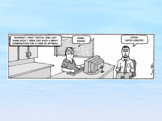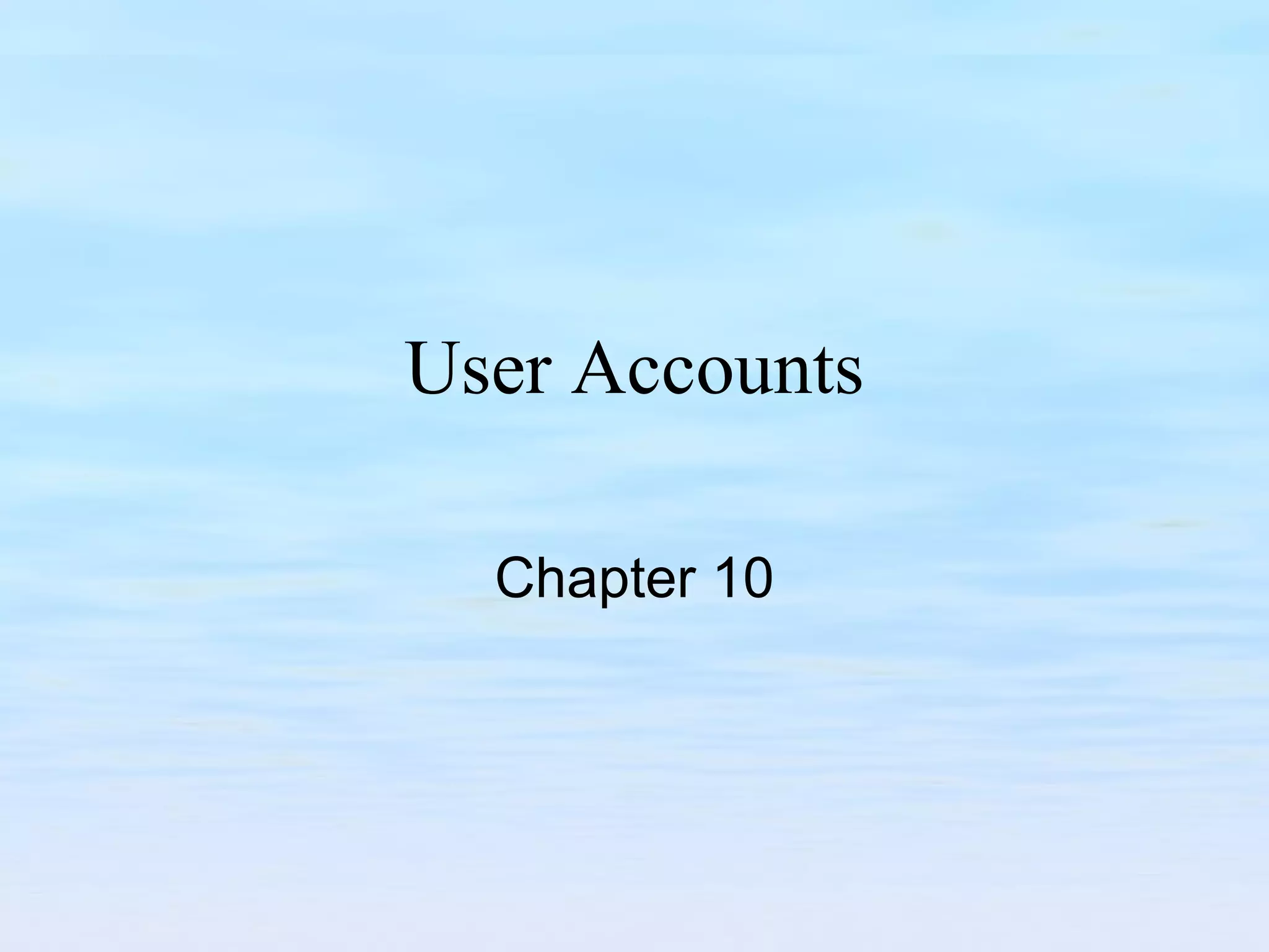 The document discusses user account management tasks for system administrators, including creating login names, assigning home directories and user IDs, setting passwords and password policies, and tools for managing user accounts. It covers challenges around reusable passwords and approaches to improve security such as password aging, lockouts for failed attempts, and one-time password tokens.