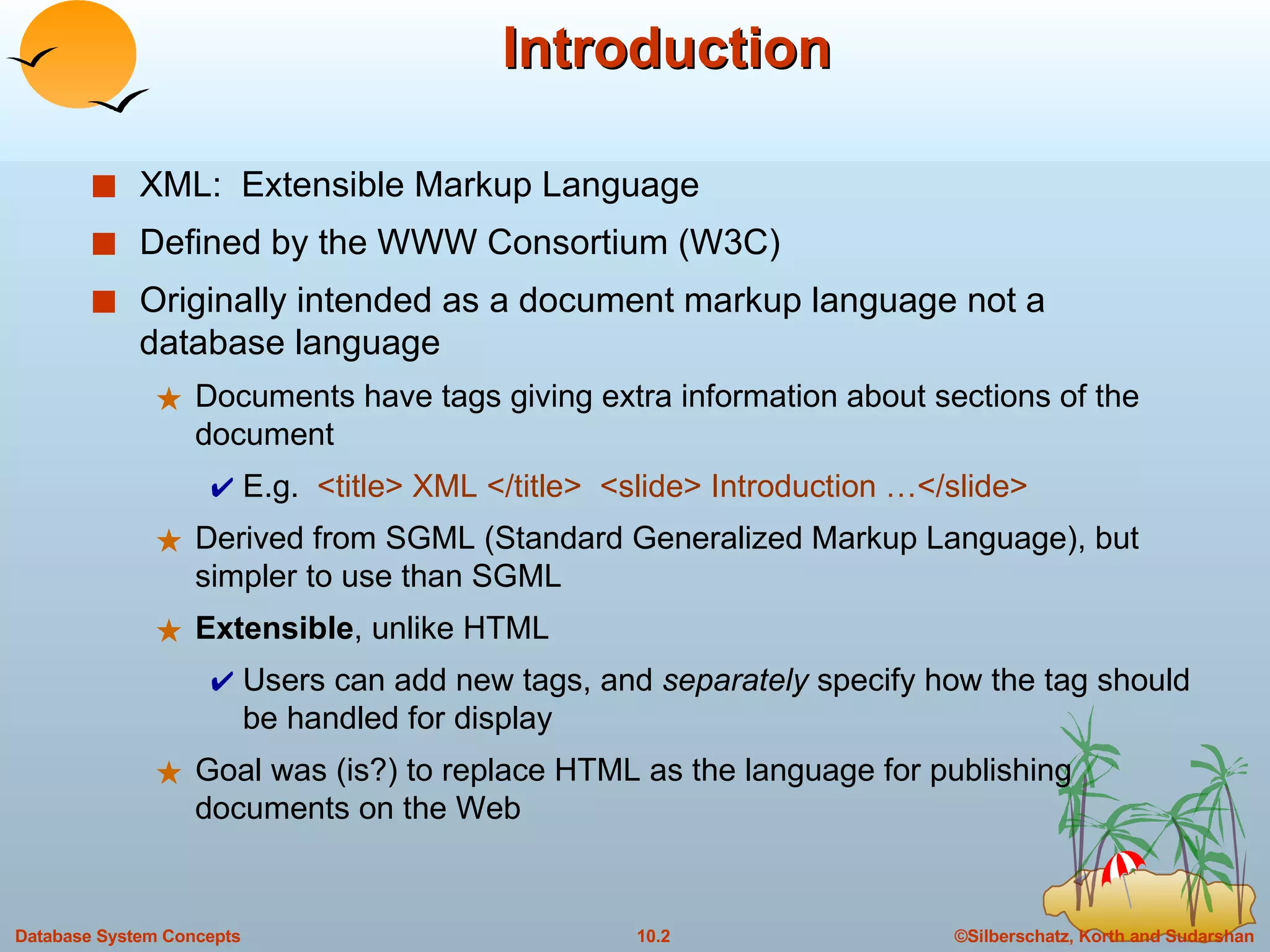 The document provides an introduction to XML, including that it is defined by the W3C as a markup language for documents and data interchange. XML allows users to define their own tags and has become widely used for data exchange between organizations. Key aspects of XML covered include elements, attributes, nesting of elements to represent relationships between data, and using Document Type Definitions (DTDs) or XML Schema to constrain the structure and relationships of XML documents.