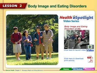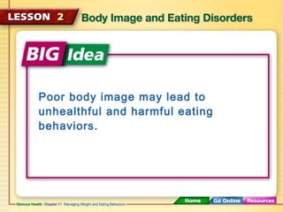 The document discusses body image, eating disorders, and fad diets. It defines key terms like anorexia nervosa, bulimia nervosa, and binge eating disorder. Poor body image and influences like the media can lead to unhealthy eating behaviors and potential eating disorders. Eating disorders are serious mental illnesses that involve extreme and dangerous eating habits. They require medical treatment to address the underlying psychological and physical health issues.