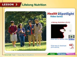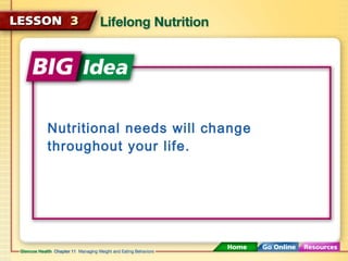 This document discusses lifelong nutritional needs and how they change throughout life. Nutritional requirements can vary based on age, gender, lifestyle, health conditions, and activity level. It also discusses vegetarian diets and how nutritional needs differ for athletes, including staying hydrated and avoiding dangerous performance enhancers. The risks of dietary supplements, especially herbal supplements and megadoses, are also covered.