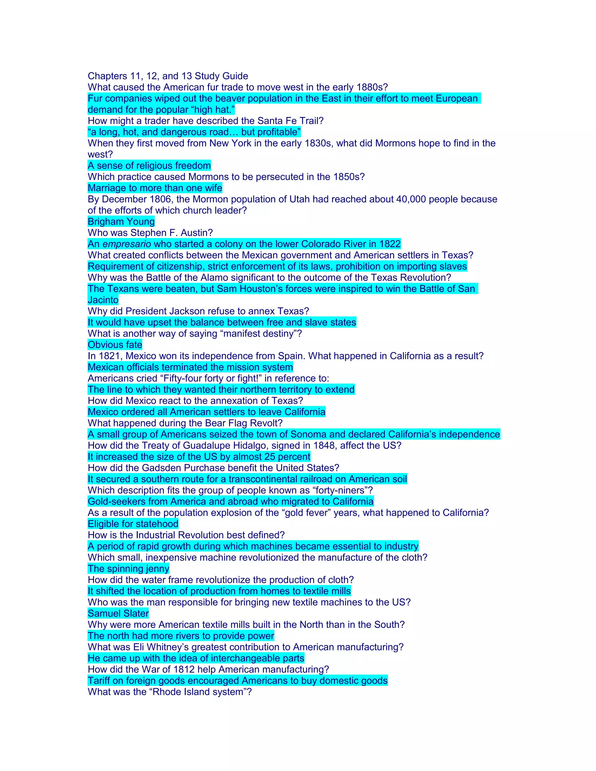 The document provides study guide questions about several topics in American history including the fur trade, Mormon migration, the Texas Revolution, westward expansion, the Industrial Revolution, cotton gin, slavery, and telegraph. It asks about key people, events, innovations, economic factors, and social aspects related to these historical periods and issues.