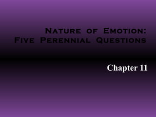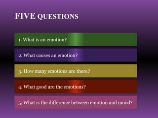 1) The document discusses five key questions about the nature of emotions: what an emotion is, what causes emotions, how many emotions there are, what functions emotions serve, and the difference between emotions and moods.