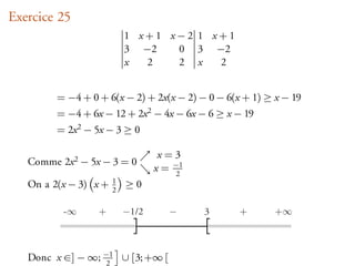 1 x+1 x−2 1 x+1 3 −2 0 3 −2 x 2 2 x 2 = −4 + 0 + 6(x − 2) + 2x(x − 2) − 0 − 6(x + 1) ≥ x − 19 = −4 + 6x − 12 + 2x 2 − 4x − 6x − 6 ≥ x − 19 = 2x 2 − 5x − 3 ≥ 0 x=3 Comme 2x 2 − 5x − 3 = 0 x = −1 2 On a 2(x − 3) x + 1 2 ≥0 -¥ + -1/2 - 3 + +¥ Donc x ∈] − ∞; −1 ∪ [3; +∞ [ 2