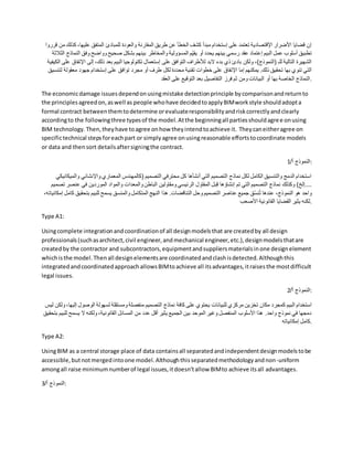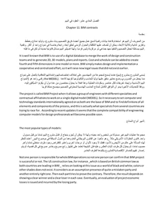 تتناول الوثيقة استخدام تقنية البيم كقاعدة بيانات رقمية لدمج جهود فرق التصميم والبناء، مما يساعد في توليد نماذج ثنائية أو ثلاثية الأبعاد وإضافة جداول التكلفة والوقت. كما تشير إلى أن اعتماد هذه التقنية يثير مسائل قانونية جديدة تتعلق بالمسؤولية والتنسيق بين المهندسين من تخصصات مختلفة. الوثيقة تستعرض أيضًا أنواع النماذج المستخدمة في البيم وتفاصيل عن كيفية إدارة وتحديد المسؤوليات بين الأطراف المعنية.