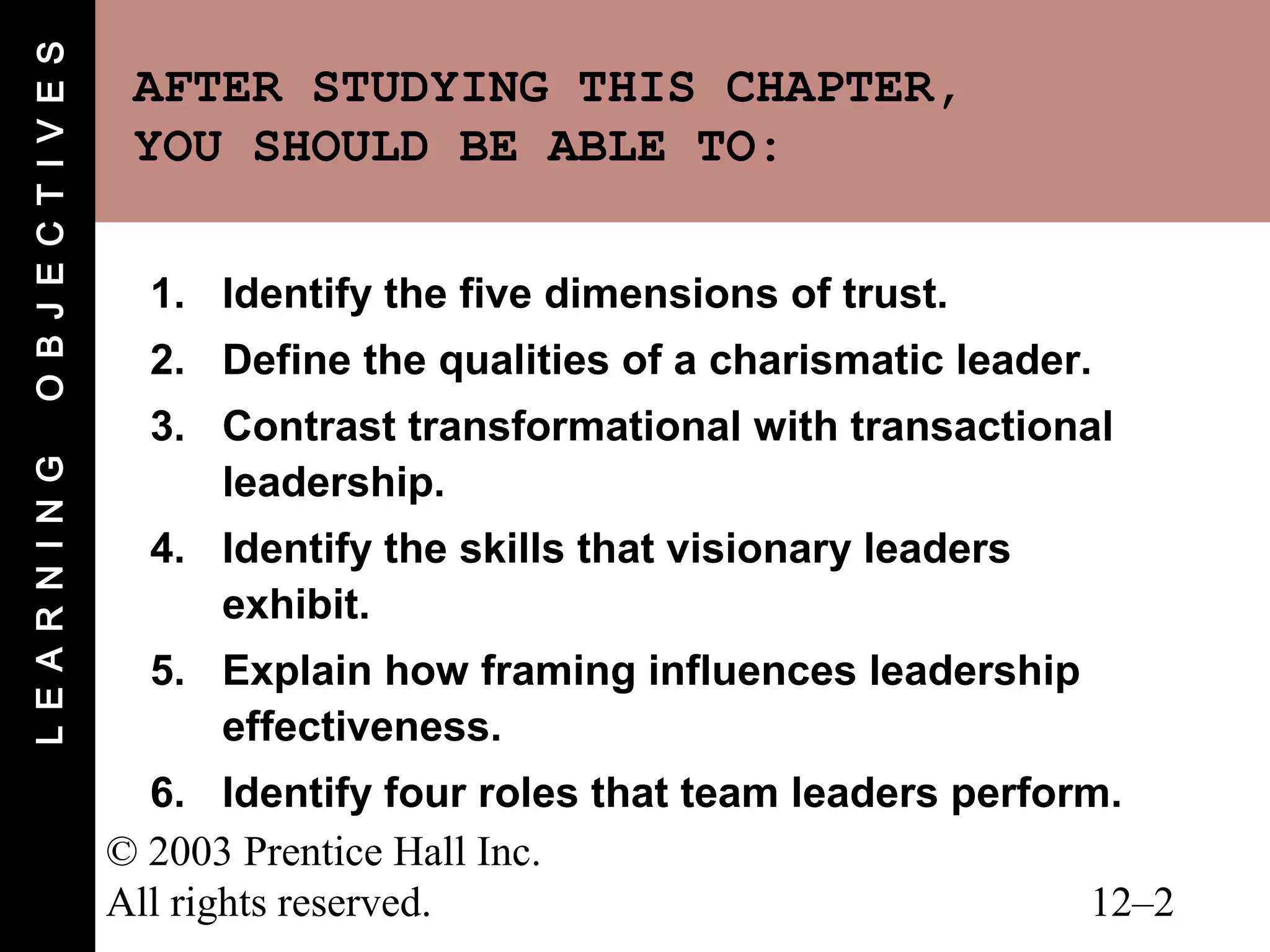 This document discusses leadership concepts from a textbook on organizational behavior. It covers dimensions of trust, characteristics of charismatic and transformational leaders, qualities of visionary leadership, roles of team leaders and mentors, and creating self-leadership. The objectives are to understand key leadership theories and apply them to analyze leadership effectiveness.