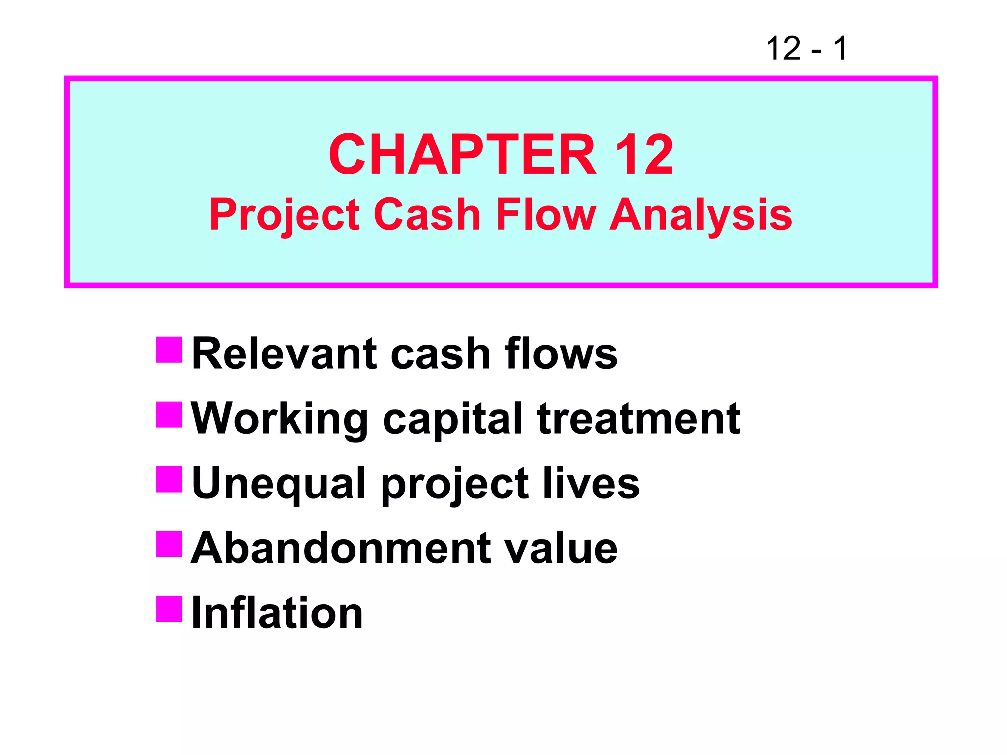 The document discusses concepts related to project cash flow analysis including relevant cash flows, unequal project lives, abandonment value, inflation, and cash flow estimation bias. It provides an example project with initial outlay, operating cash flows, tax rate, salvage value, and cash flows over 4 years. It calculates NPV, IRR, MIRR, and payback for the example project. The document also discusses making decisions between mutually exclusive projects using replacement chains and equivalent annual annuity analysis.