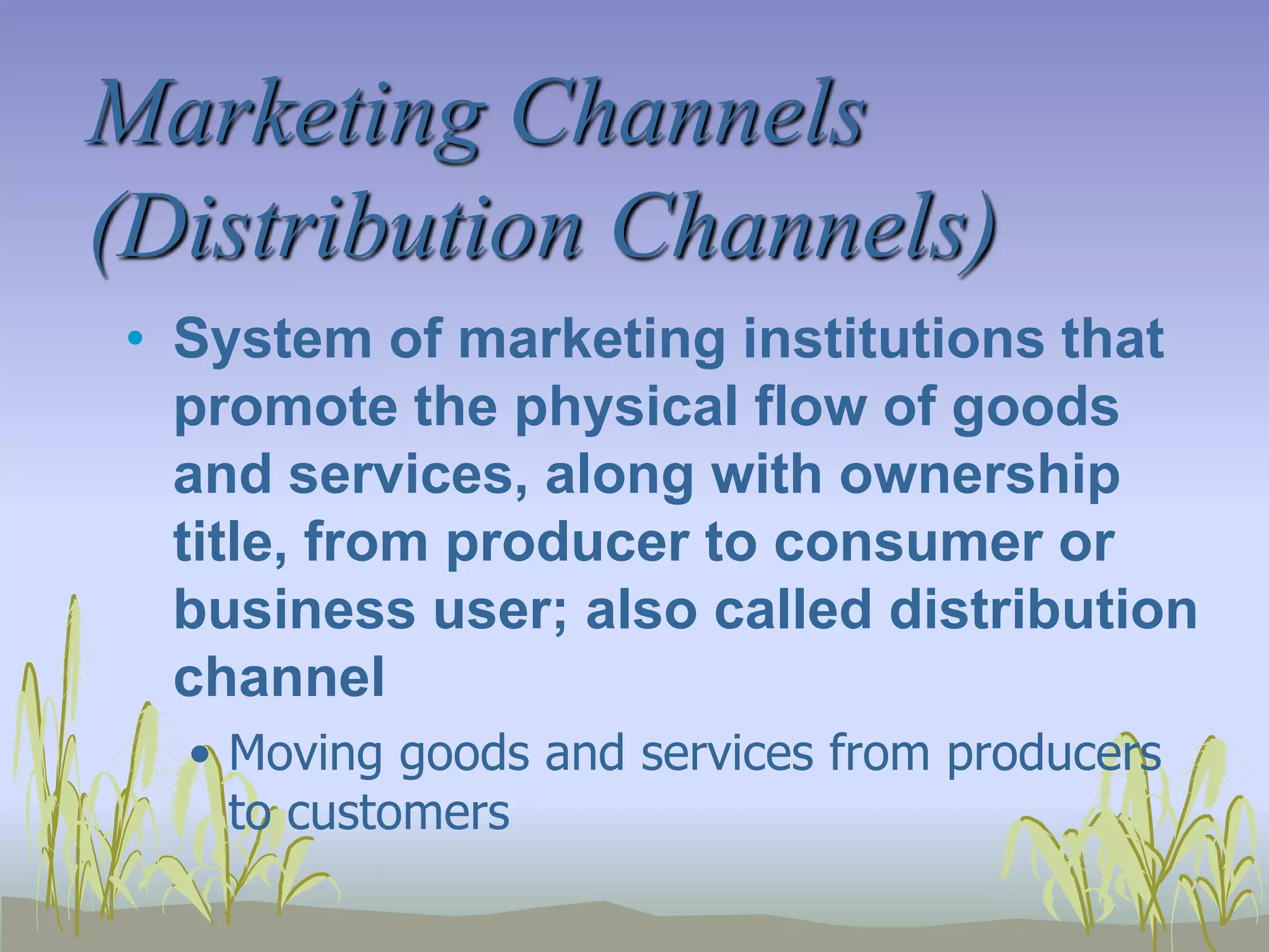 This document discusses marketing channels and logistics/supply chain management. It defines marketing channels as the system that promotes the flow of goods from producer to consumer, including ownership transfers. There are different types of channels like direct, wholesale, and dual distribution. Channel strategy decisions include determining distribution intensity like intensive, selective, or exclusive distribution. Logistics and supply chain management coordinates information and physical flow among channel members. It includes transportation, warehousing, inventory control and other physical distribution functions.