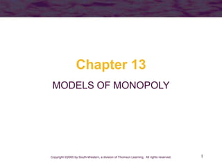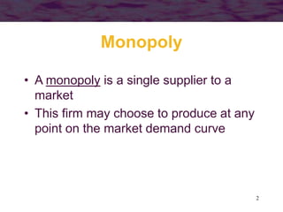 This document discusses models of monopoly and barriers to entry. It explains that a monopoly is a single supplier in a market and can choose any point on the demand curve to produce. Barriers to entry, which are the source of monopoly power, can be technical or legal. Technical barriers include economies of scale, unique knowledge, or ownership of resources. Legal barriers are created by patents, franchises, or lobbying. A monopolist maximizes profits where marginal revenue equals marginal cost and charges a price above marginal cost. The inverse elasticity rule relates the markup to demand elasticity. Monopolies can impact resource allocation, consumer surplus, and welfare losses compared to competition.
