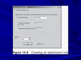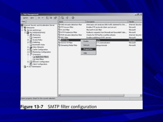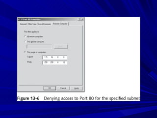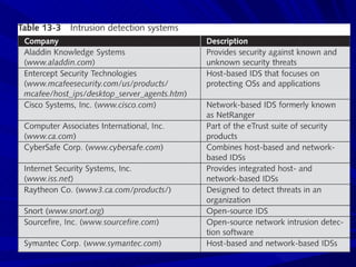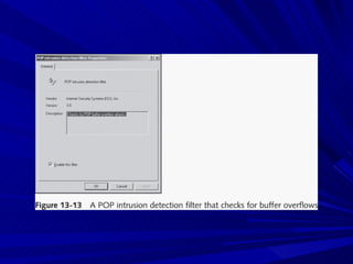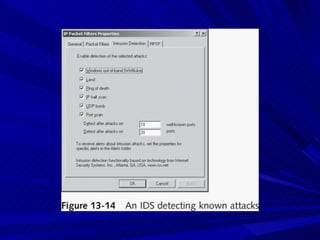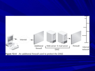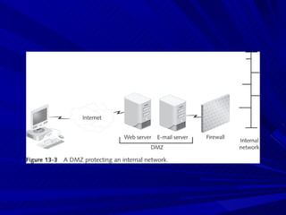 The document describes various network security devices including routers, firewalls, intrusion detection systems, and honeypots. It discusses how routers direct network traffic, common firewall technologies like network address translation and stateful packet inspection, and examples of firewall products from Cisco and Microsoft. It also covers how intrusion detection systems monitor network traffic for attacks and how honeypots are used to trap hackers by appearing vulnerable but containing no important data.