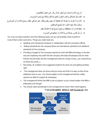 This document discusses standards for BIM and CAD management. It states that managing BIM and CAD requires various management skills, including dealing with senior management, staff recruitment, budgets, and training. It emphasizes that setting common standards helps when multiple people work together on the same project, as it establishes a shared language and conventions for file naming and organization. The document also provides a table outlining international BIM standards and guidelines that different countries and organizations have developed.