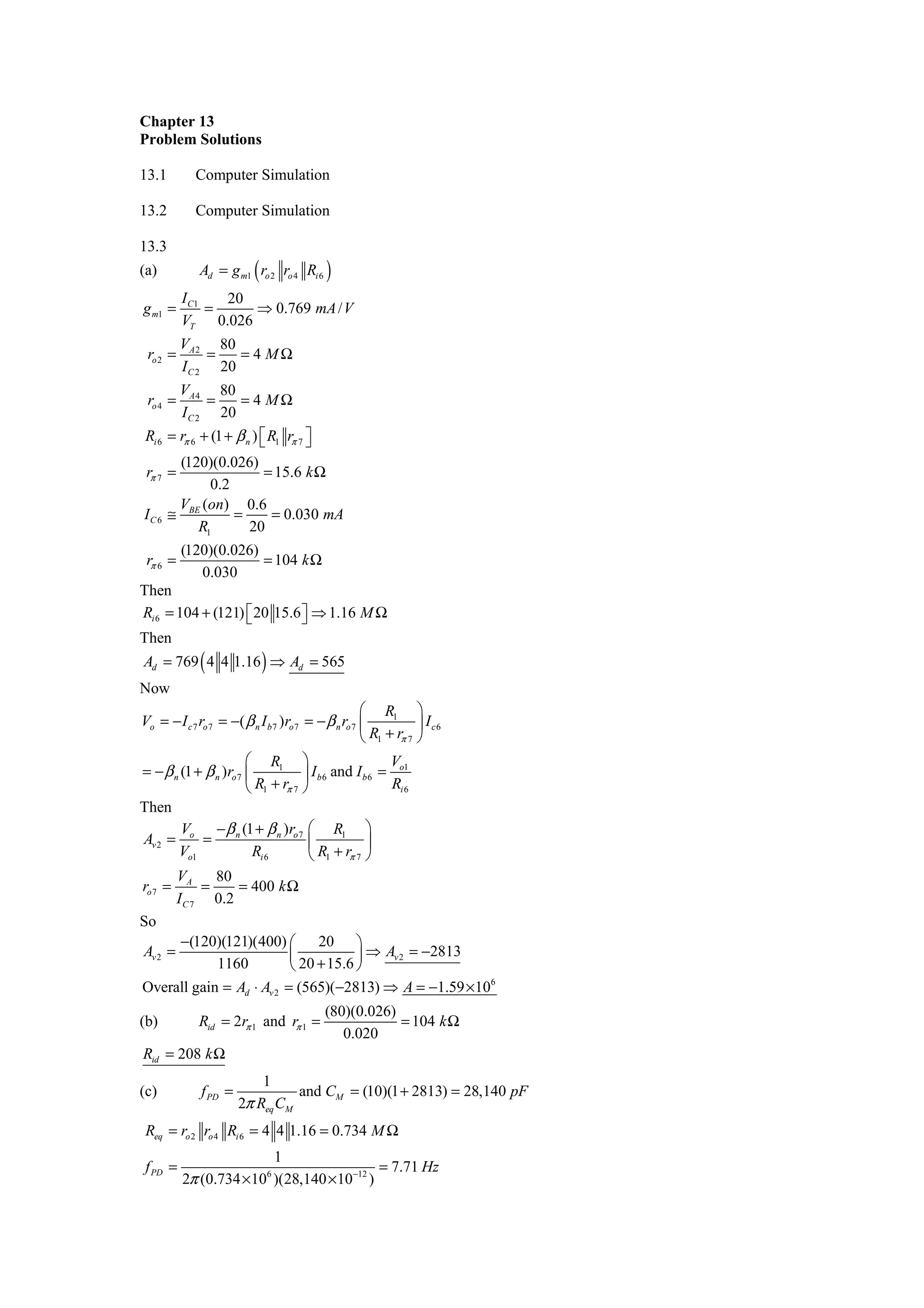 1) Problem 13.1 provides a computer simulation of a circuit and calculates the overall gain as -1.59x106.