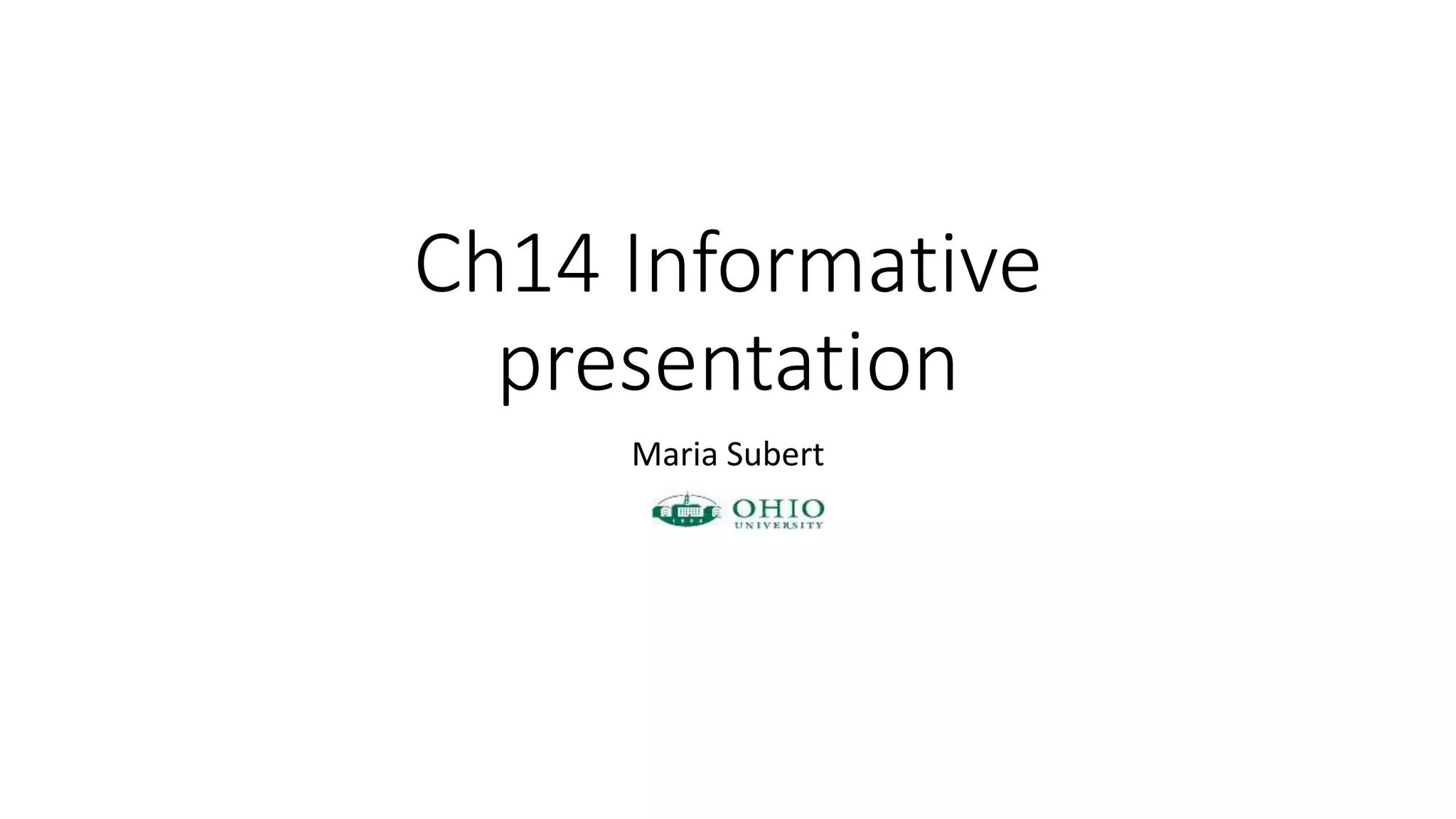 The document discusses how to effectively present informative information to an audience. The goals of an informative presentation are to increase audience knowledge on a topic, help them learn and clarify complex issues, and demonstrate useful information. To engage the audience, the presenter should create interest in the topic, show relevance to the audience, use external motivations for listening, and select informative content that uses points, examples, and illustrations to clarify information. When designing the content, the presenter should focus on main ideas and generalizations rather than details, use simple words and concrete concepts, and explain the topic's relevance to the audience. Skills for informative speaking include defining, describing, explaining, narrating, and demonstrating.