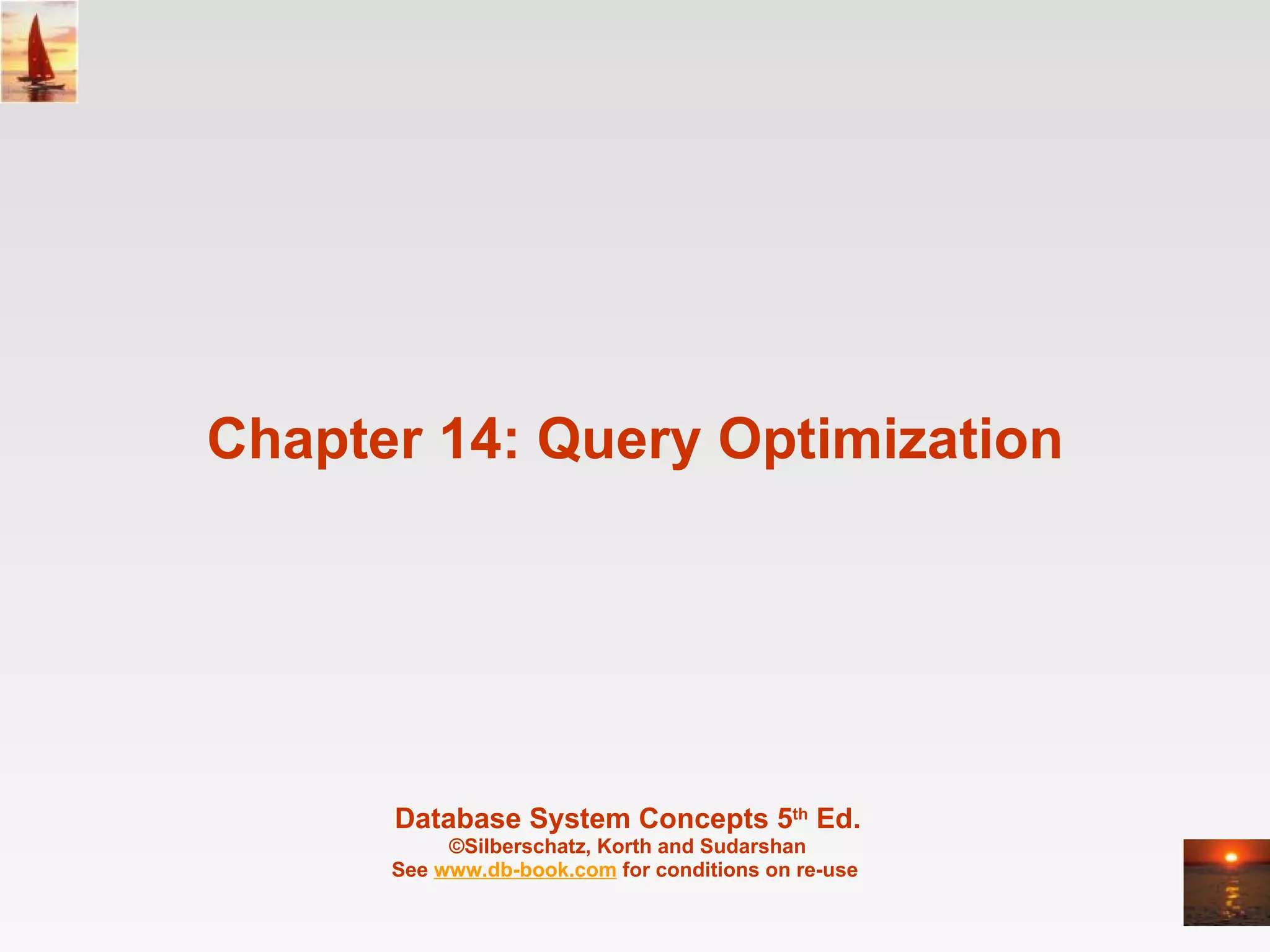 1. The document discusses techniques for query optimization in database systems, including generating equivalent query expressions, estimating expression costs, and using dynamic programming to choose the lowest-cost evaluation plan.