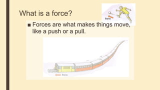 Forces can cause objects to move, stop, change speed or direction. There are two main types of forces - contact forces which act when objects touch, and non-contact forces like gravity and magnetism which act over a distance. Friction is a contact force that opposes motion between surfaces in contact. Reducing friction, through lubricants or streamlining, can reduce resistance to motion. Air and water resistance are non-contact forces caused by fluids pushing back on objects moving through them. The shape of objects can be designed to minimize resistance and maximize speed.
