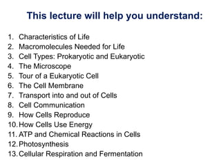 This chapter discusses the basic unit of life - the cell. It defines key characteristics of life and explains the basic structures and functions of cells, including their ability to obtain and use energy, communicate, reproduce, and transport materials. Specifically, it compares prokaryotic and eukaryotic cells, describes cellular organelles and membranes, and explains important processes like photosynthesis and cellular respiration that allow cells to harness and utilize energy.