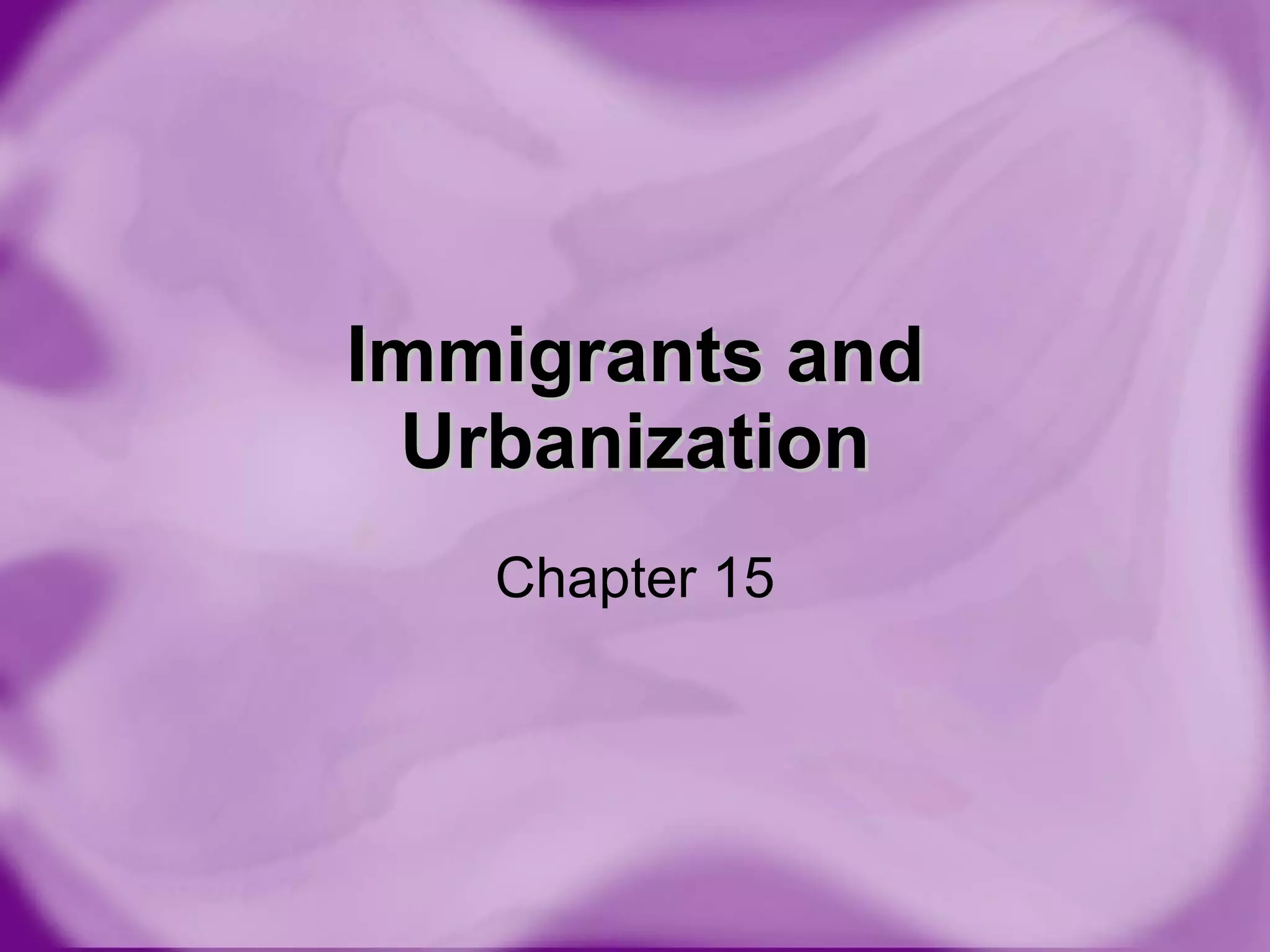 The document discusses immigration patterns to the United States in the late 1800s and the challenges of urbanization. It describes how immigrants in the 1800s primarily came from northern and western Europe, while after 1890 they increasingly came from southern and eastern Europe. Upon arrival, immigrants faced difficult journeys and conditions at places like Ellis Island, and had to establish ethnic communities in cities. Rapid urbanization strained housing, transportation, water, sanitation, and caused other issues like crime and fires. Reforms attempted to address these problems through government intervention, settlement houses, and social welfare programs.