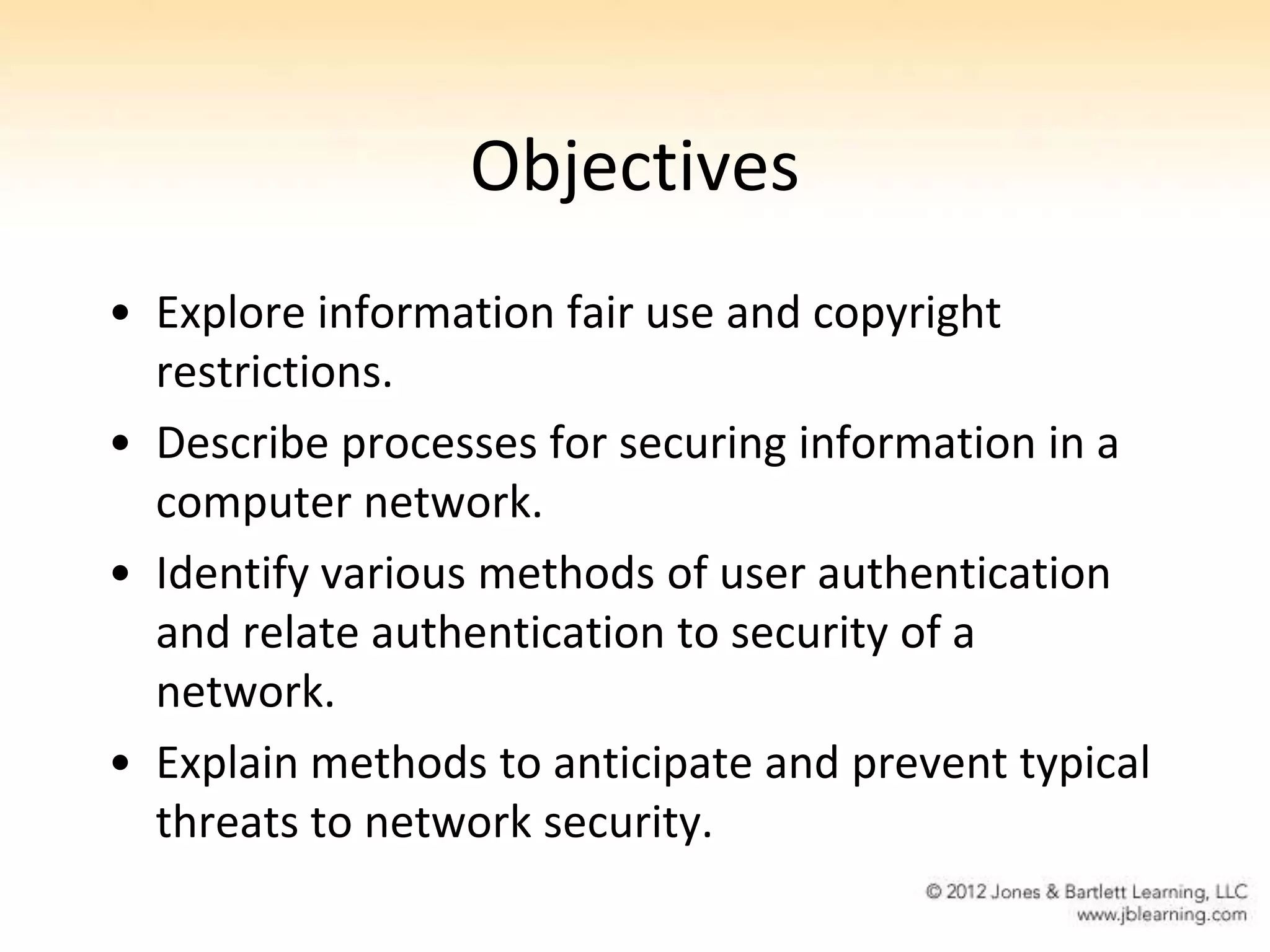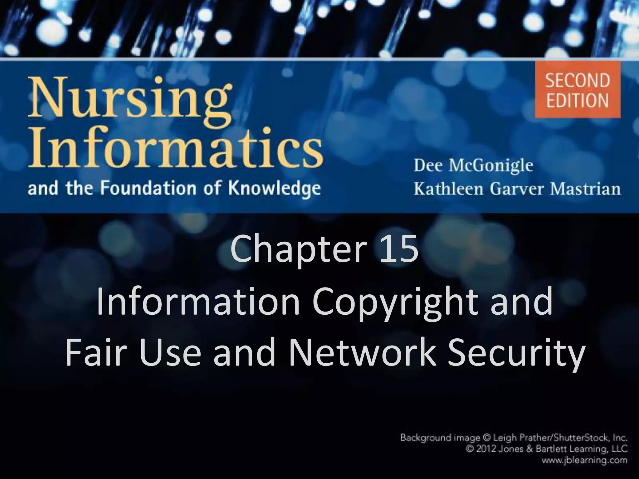This document discusses information security and copyright in a healthcare context. It covers fair use principles, securing network information through authentication, authorization and other methods. It also discusses threats like hackers, viruses and insiders and tools to enhance security like firewalls and intrusion detection. The document concludes with questions about fair use of copyrighted material and appropriate use of patient information.