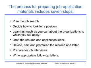 The document outlines the key steps and considerations for preparing job application materials, including planning a job search, researching employers, drafting a resume and cover letter, preparing for interviews, and following up after interviews. It provides guidance on various components of the application process from multiple angles such as different formats for resumes, tips for networking and online profiles, common interview questions to expect, and templates for follow-up letters.