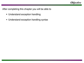 The document discusses exception handling in Java. It defines exceptions as abnormal conditions that occur during runtime and disrupt normal program flow. It describes different types of exceptions like checked, unchecked, and errors. It explains concepts like exception handling syntax using try, catch, finally blocks to maintain program flow. It provides examples to demonstrate exception handling and resolving exceptions in catch blocks.