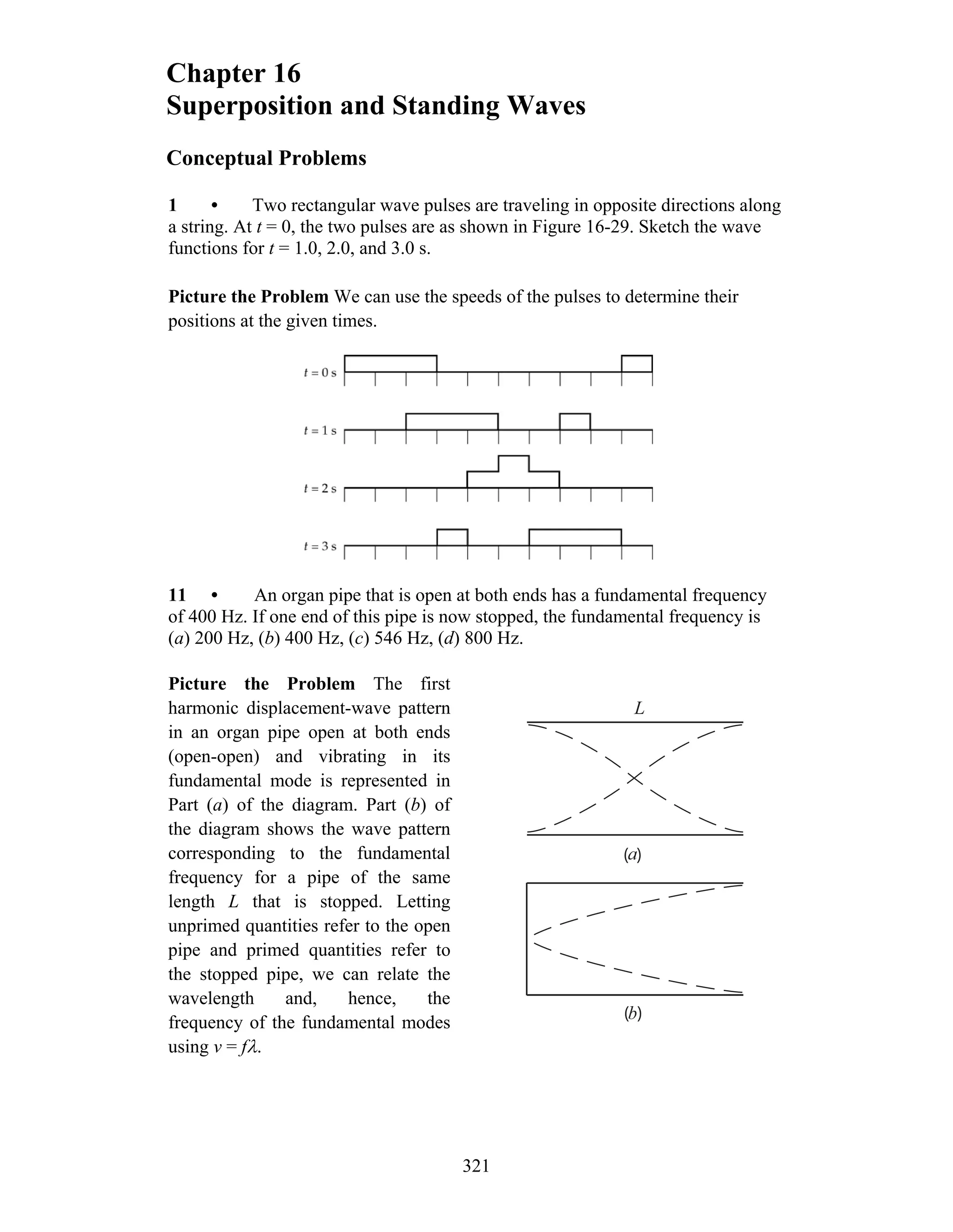 1. The document provides conceptual problems and solutions related to superposition and standing waves. It discusses topics like wave pulses traveling in opposite directions, fundamental frequencies of open and closed organ pipes, and using resonance frequencies to estimate air temperature.