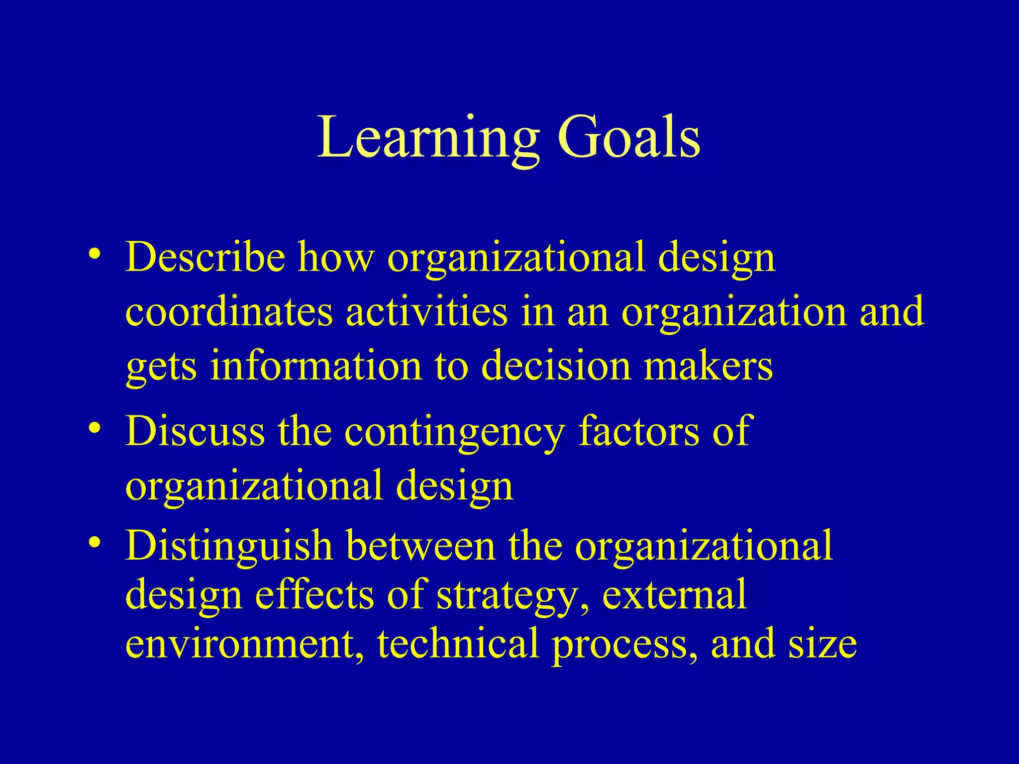 This chapter discusses organizational design and the factors that influence design choices. It describes the contingency factors of strategy, external environment, technical processes, size, and their relationships. The chapter outlines various forms of organizational design including functional, divisional, hybrid, matrix, and evolving forms like self-managing teams and virtual organizations. It also discusses international and ethical aspects of organizational design decisions.