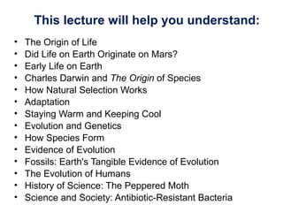 The document outlines the evolution of life, addressing key topics such as the origin of life on Earth, evidence of evolution, and natural selection, while also discussing the evolution of humans and antibiotic-resistant bacteria. It covers the transition from early prokaryotic life through the evolution of eukaryotes, Darwin's theory of natural selection, and various reproductive barriers in species formation. Additionally, it provides historical examples like the peppered moth and emphasizes the importance of responsible antibiotic use to combat resistance.