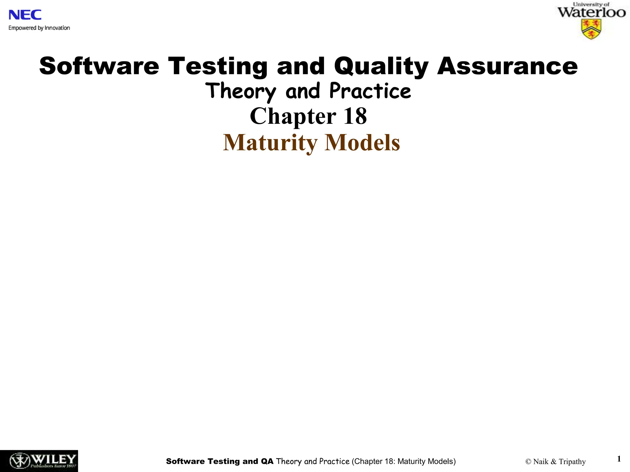 Chapter 18 of the document discusses maturity models in software testing and quality assurance, focusing on frameworks such as the Capability Maturity Model (CMM), Test Process Improvement (TPI), and Testing Maturity Model (TMM). It outlines key concepts like process evaluation, incremental improvements, and various stages of maturity, which organizations can use to enhance their software development and testing processes. Each maturity model provides structured guidance for improving quality, efficiency, and cost-effectiveness in testing practices.