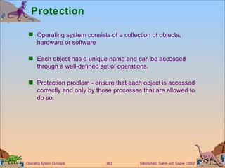 The document discusses different approaches to implementing access control and protection in operating systems, including using access matrices to represent access rights for domains and objects, and capability-based systems where capabilities function like keys to allow access. It also covers revoking access rights, language-based protection where policies are specified in code, and how protection is implemented in Java using protection domains and stack inspection.
