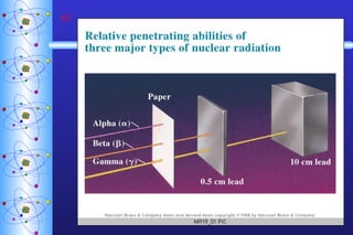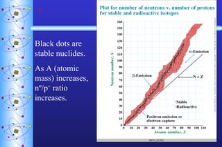 1) Nuclear stability and radioactive decay involve the emission of particles like alpha and beta from unstable nuclei. Different types of radiation (alpha, beta, gamma) require different shielding methods.