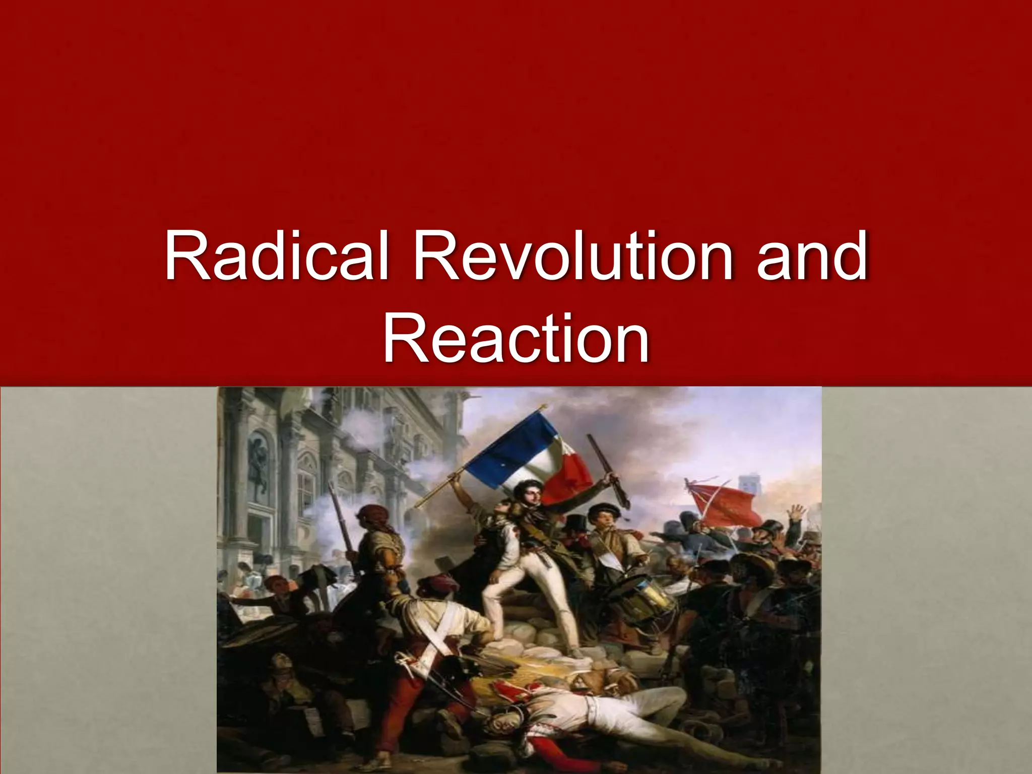 The document summarizes the radical phase of the French Revolution from 1792-1794. It describes the rise of radical groups like the Paris Commune and the Jacobins, the execution of King Louis XVI after a split over his fate, and the establishment of the Committee of Public Safety led by Robespierre. This period saw the Reign of Terror where tens of thousands perceived as enemies of the revolution were executed. Robespierre's growing paranoia led to his own downfall and execution in 1794, ending the Reign of Terror.