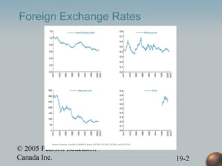 This document provides an overview of key concepts related to foreign exchange rates and the foreign exchange market. It defines spot and forward exchange rates, currency appreciation and depreciation, and discusses how these impact domestic businesses and consumers. The law of one price and purchasing power parity (PPP) are explained. Factors that can affect exchange rates in the long run are also outlined, including how expected returns, interest rate parity, and shifts in the RF and RD curves impact the equilibrium exchange rate. The document examines sources of exchange rate volatility such as fluctuations in expectations of future exchange rates and the potential for exchange rate overshooting.