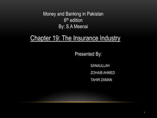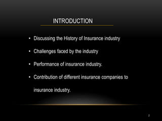 The document summarizes the insurance industry in Pakistan. It discusses the history and types of insurance companies including life insurance companies, general insurance companies, and Takaful insurance companies. It also discusses the performance and growth of the insurance industry from 2002-2007, including increases in assets, capital adequacy ratios, reserves, and profits of insurance companies. The challenges faced by the industry are also mentioned.