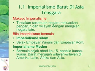 Dokumen tersebut membincangkan tentang pengaruh imperialisme Barat di Asia Tenggara yang menyebabkan perubahan sistem pentadbiran dan politik di negara-negara seperti Filipina, Indonesia, Burma, Indochina, dan negeri-negeri Melayu. Ia juga menyentuh faktor-faktor yang mencetuskan gerakan nasionalisme di rantau ini untuk melawan penjajahan asing."