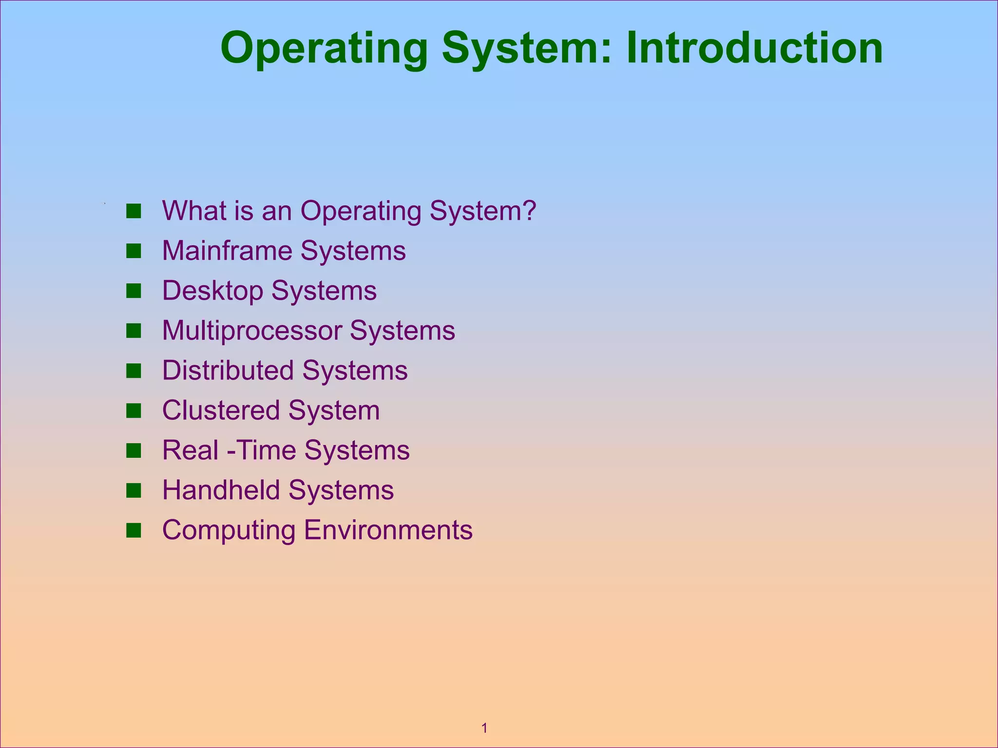 This document provides an overview of different types of operating systems. It discusses operating systems for mainframe systems, desktop systems, multiprocessor systems, distributed systems, clustered systems, real-time systems, handheld systems, and different computing environments. The key aspects that an operating system controls are the allocation and sharing of resources like the CPU, memory, storage, and I/O devices among users and their programs.