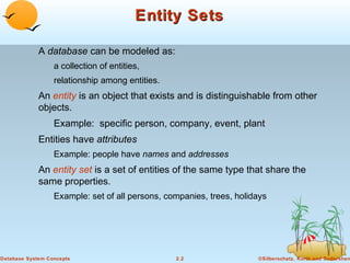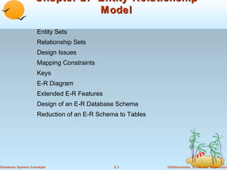 The document discusses entity-relationship (E-R) modeling concepts used to design databases. It defines entity sets as collections of entities that share common properties and attributes. Relationship sets describe associations between entity sets. E-R diagrams graphically represent entity sets as rectangles, relationship sets as diamonds, and attributes as ellipses linked to the appropriate sets. The document also covers mapping cardinalities between entity sets, roles that clarify relationships, and cardinality constraints depicted in E-R diagrams. The goal of E-R modeling is to design an E-R schema to logically represent entities, attributes, and relationships in a database.