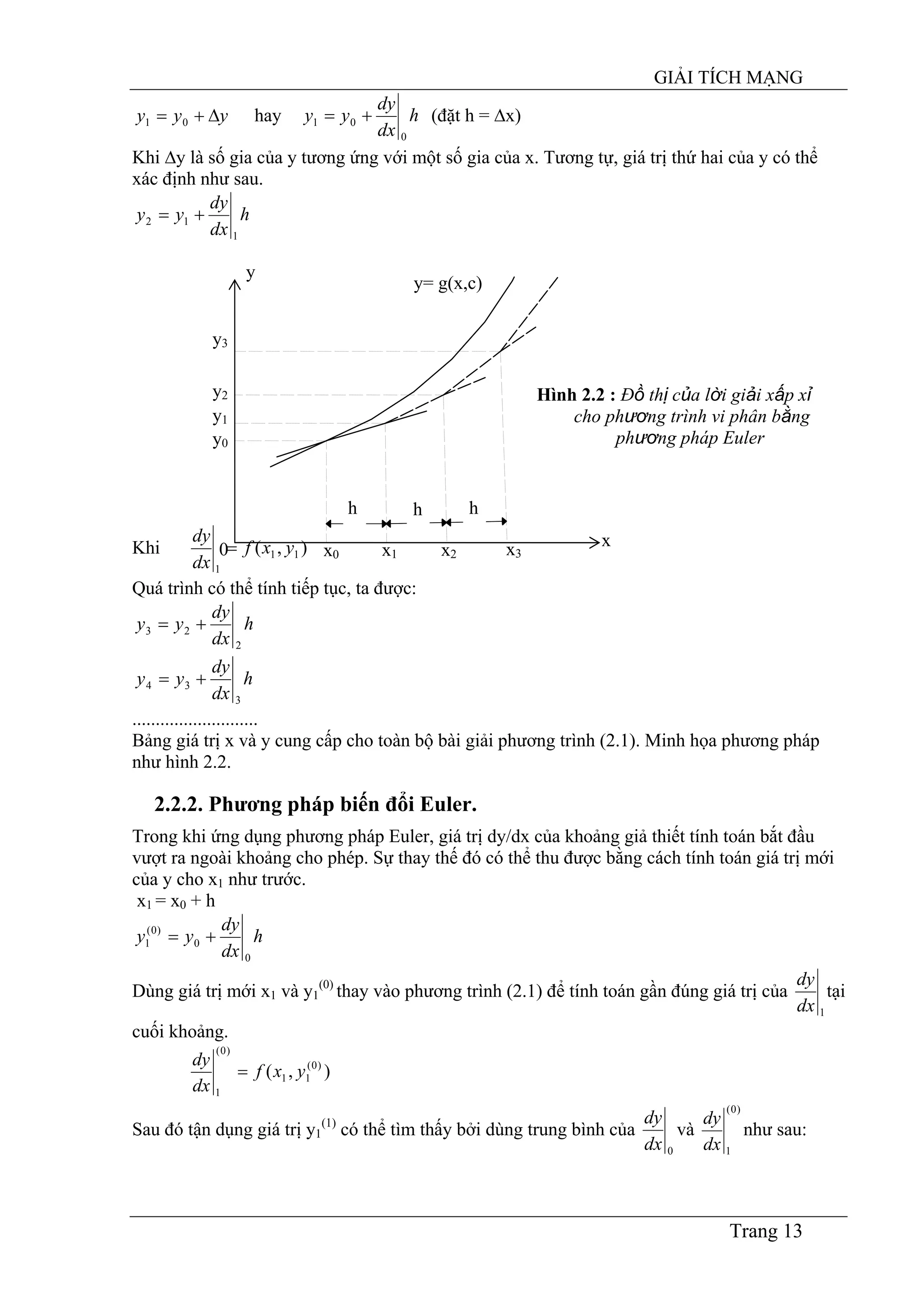 Tài liệu trình bày cách giải phương trình vi phân bằng các phương pháp số, đặc biệt nhấn mạnh vào phương pháp Euler, biến đổi Euler, Picard và Runge-Kutta. Những phương pháp này cung cấp các cách tiếp cận gần đúng hỗ trợ giải các hệ phương trình phức tạp mà không thể giải quyết chính xác. Sự chính xác của các nghiệm gần đúng phụ thuộc vào phương pháp lựa chọn và kích thước khoảng giá trị sử dụng.