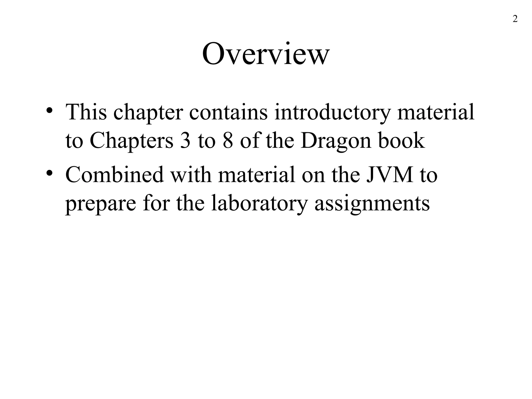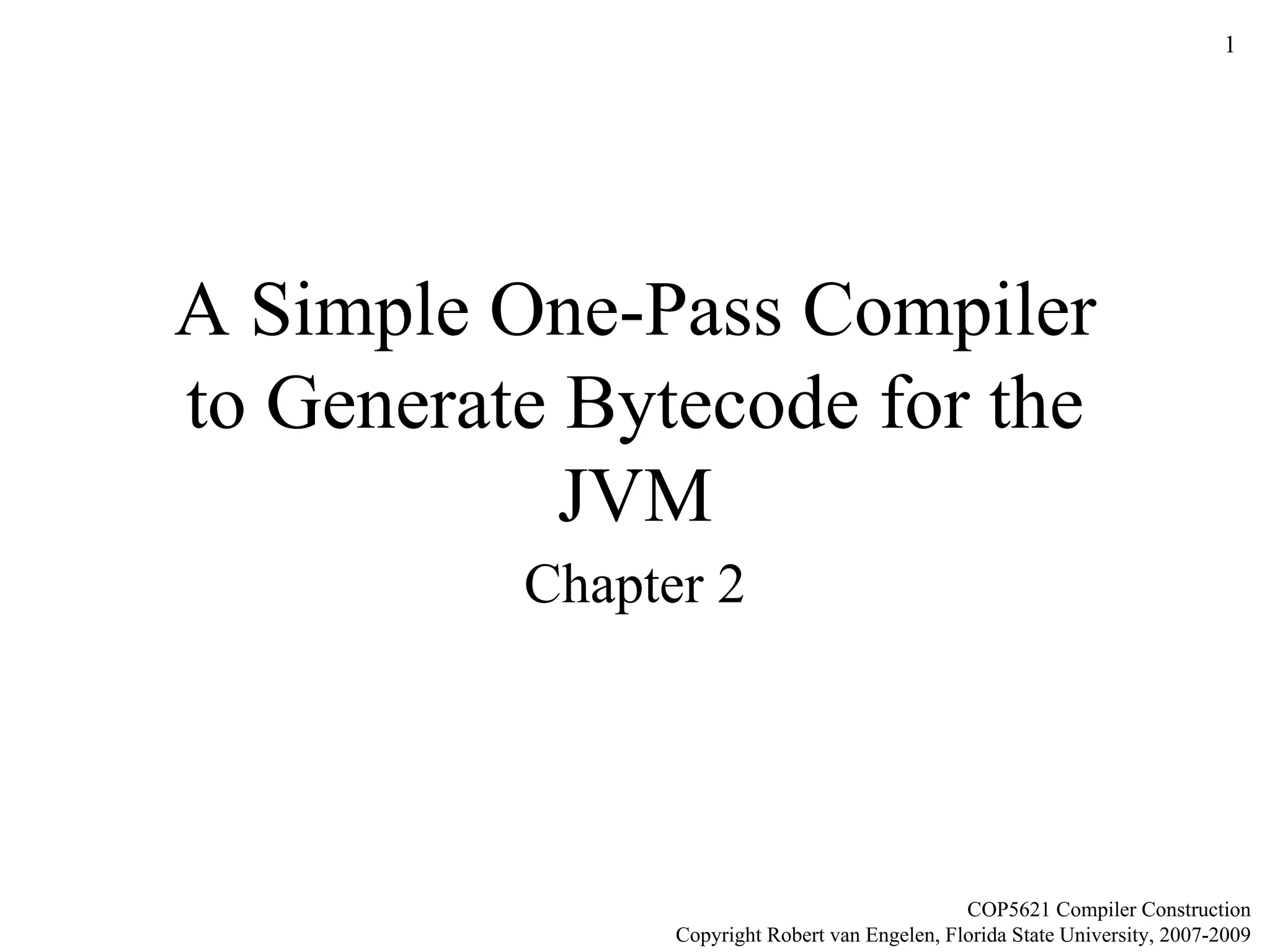 This document provides an overview of building a simple one-pass compiler to generate bytecode for the Java Virtual Machine (JVM). It discusses defining a programming language syntax, developing a parser, implementing syntax-directed translation to generate intermediate code targeting the JVM, and generating Java bytecode. The structure of the compiler includes a lexical analyzer, syntax-directed translator, and code generator to produce JVM bytecode from a grammar and language definition.