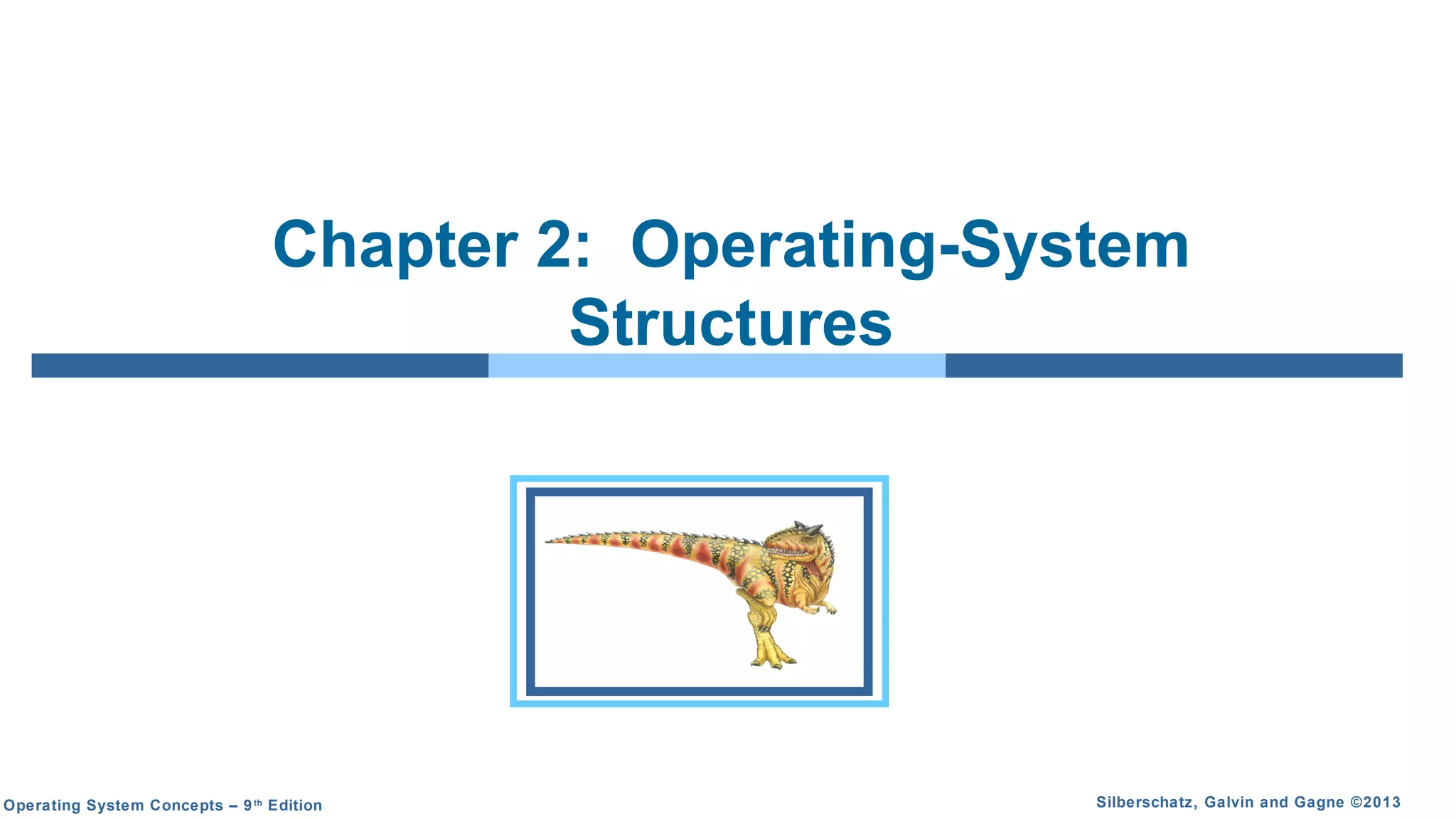 This document discusses the structure and design of operating systems. It covers the services provided by operating systems, including user interfaces, program execution, I/O operations, file management, communications, error detection, resource allocation, accounting, and protection. It also describes system calls, system programs, and various approaches to structuring operating systems, such as simple, layered, and microkernel structures. Finally, it addresses operating system implementation, debugging, and the system boot process.