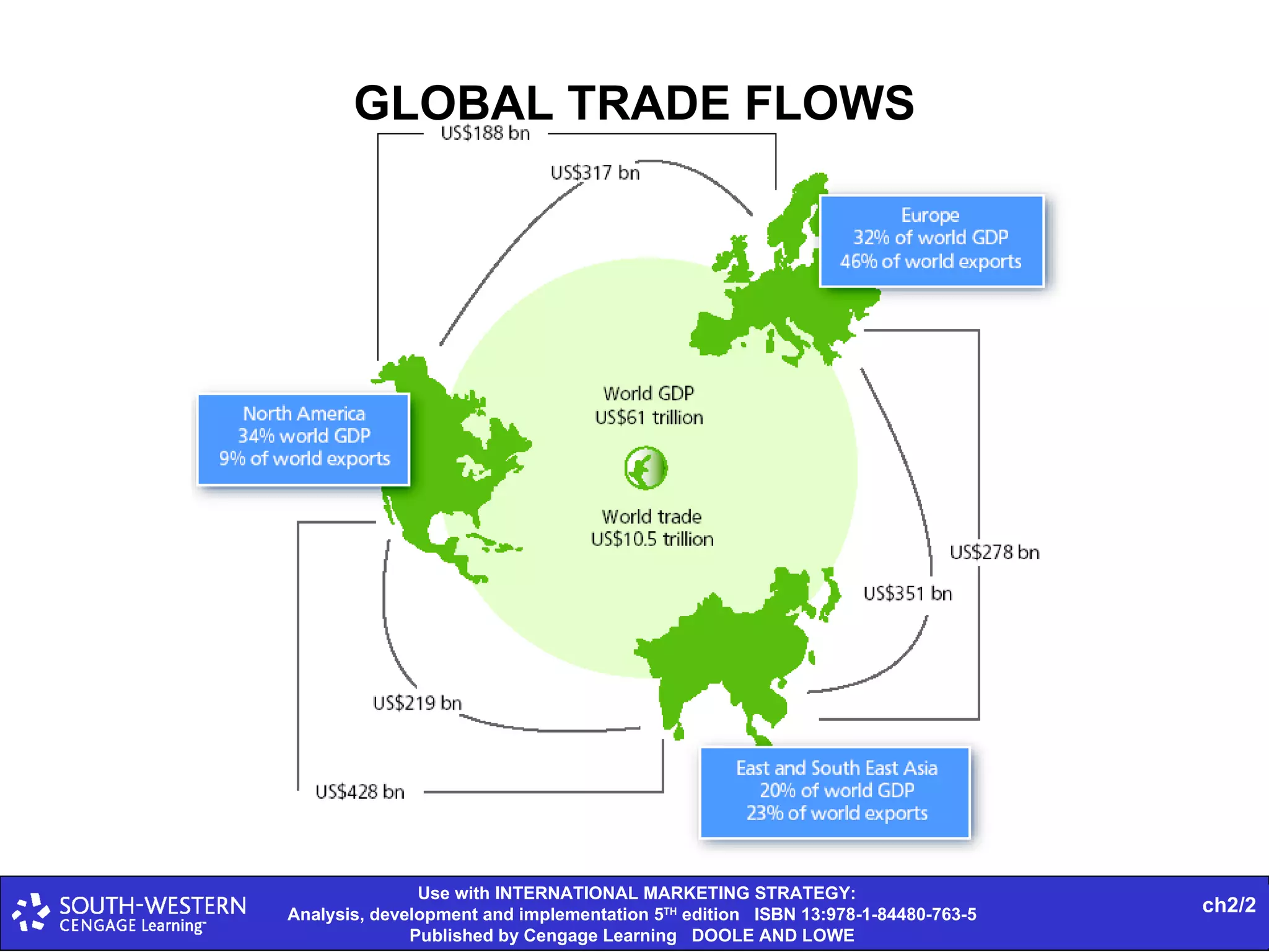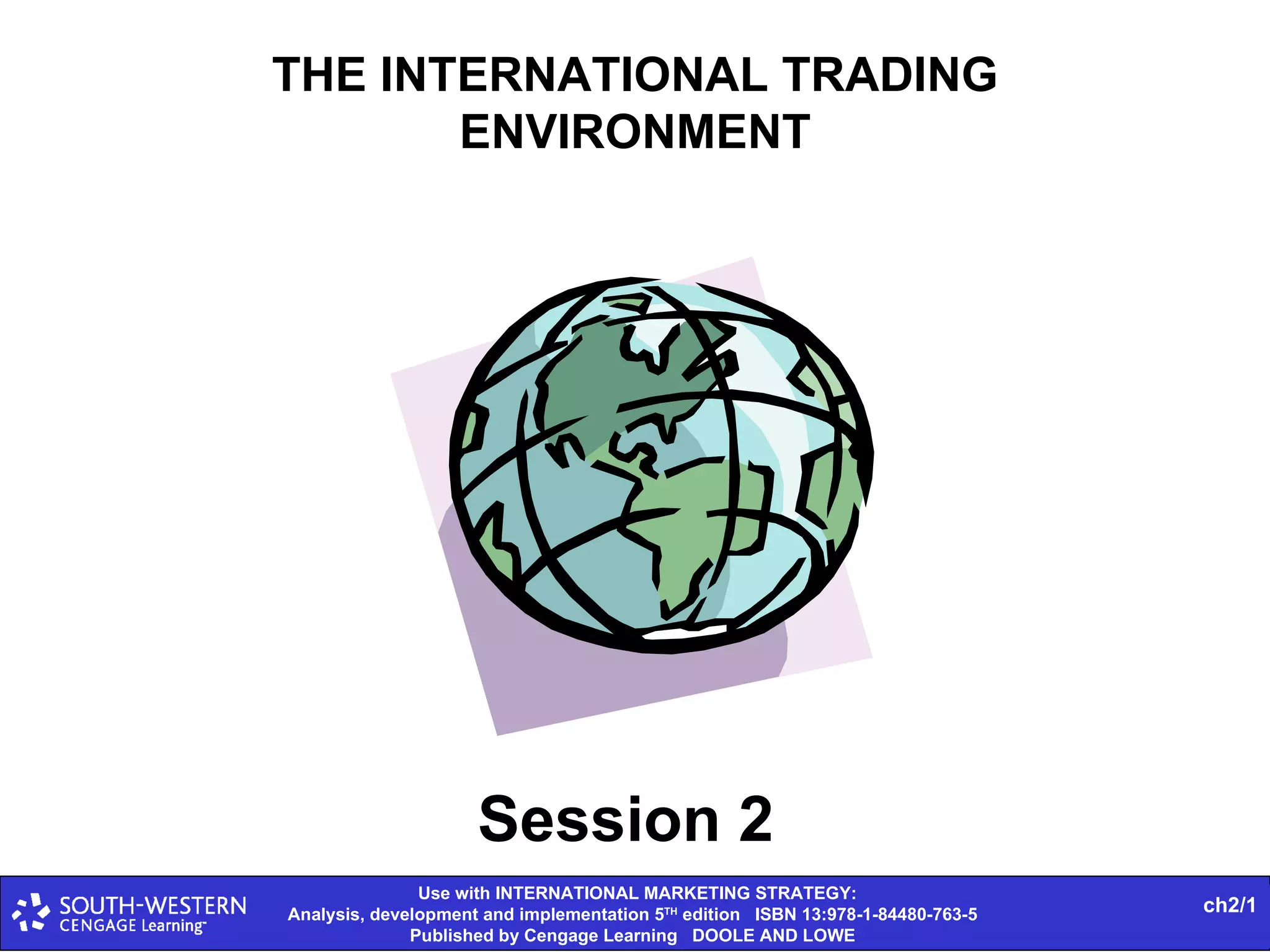 The document provides statistics on global trade flows and the international trading environment. It shows that in 2007, the top exporting countries by percentage of world exports were Germany at 9.3%, the United States at 8.7%, and China at 7.3%. It also includes data on consumer price inflation and GDP growth rates in 2007 for various countries. Additionally, it discusses concepts like comparative advantage, market entry barriers, and major world trading institutions and regions.