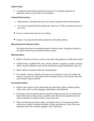 Culture is shaped by the cumulative knowledge, beliefs, and objects acquired by a group over generations. There are two views of cultural determinism - one that sees people as products of their culture with no free will, and one that is more optimistic about human potential. Cultural relativism holds that no culture is intrinsically superior and each should be understood on its own terms. As technology increases cultural diffusion and leveling, reducing differences between societies, it also allows new forms of culture to emerge.