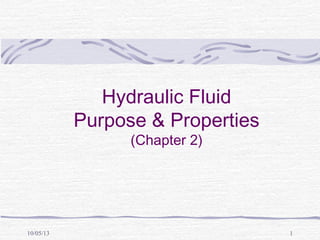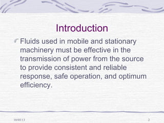 This document discusses the properties and functions of hydraulic fluids used in machinery. It outlines that hydraulic fluids must effectively transmit power while providing lubrication, sealing, and heat dissipation. The key properties of good hydraulic fluids include good lubricity, ideal viscosity, chemical/thermal stability, compressibility, fire resistance, heat transfer ability, low density/foam resistance, and non-toxicity. It then examines viscosity and viscosity index in depth, as well as other important properties like pour point, lubricating ability, rust/corrosion protection, and the role of additives and inhibitors.