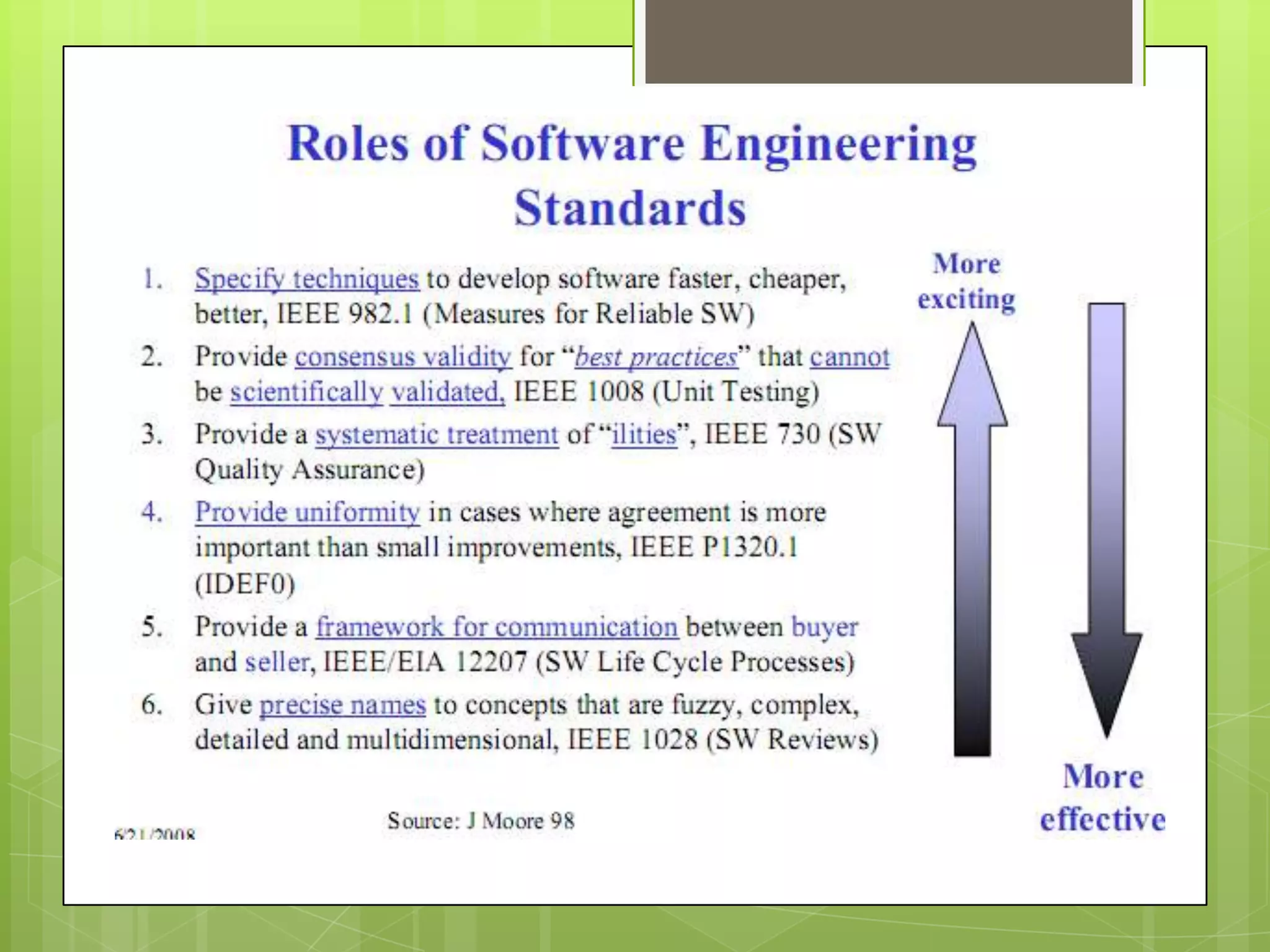 This document discusses software engineering standards. It defines a standard as mandatory requirements that prescribe a disciplined, uniform approach to software development. Standards help specify techniques, provide consensus on best practices, and give precise names to concepts. There are approximately 315 software engineering standards maintained by 46 organizations. Standards cover processes, techniques/tools, and applicability across different domains. Using standards helps establish requirements, define common frameworks, clarify roles, and avoid reinventing proven practices. Sources of standards include organizations, professional groups, governments, and standards bodies like ISO. ISO consolidates existing technology and improves products, business, and buyer protection.