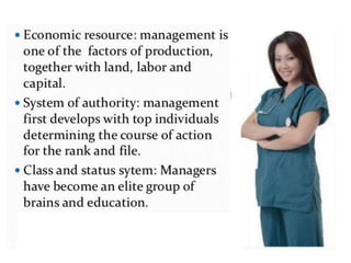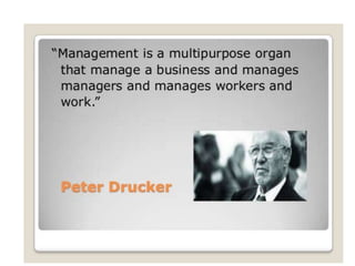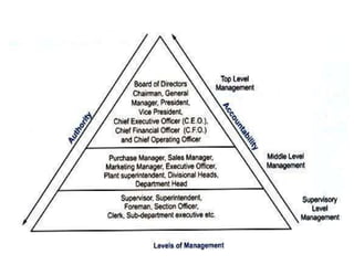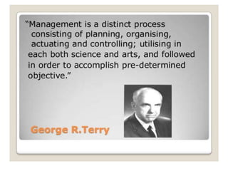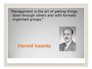 2. It describes management functions such as planning, organizing, staffing, directing, controlling, and decision making. Scientific management by F.W. Taylor and its four principles are also summarized.